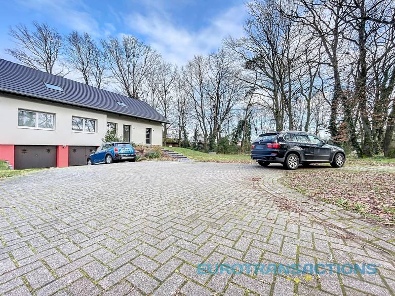 La disposition des pièces permet une circulation fluide et agréable entre les espaces de vie, avec de grandes fenêtres et des vues panoramiques sur le terrain autour de la maison.