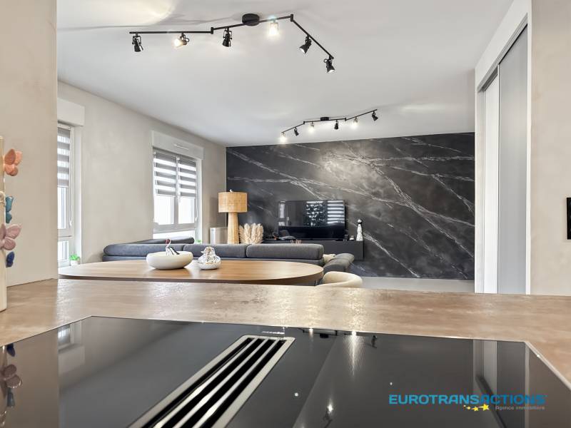 • Salon-séjour lumineux avec cuisine ouverte et équipée, donnant sur une terrasse d’environ 6m² avec store.