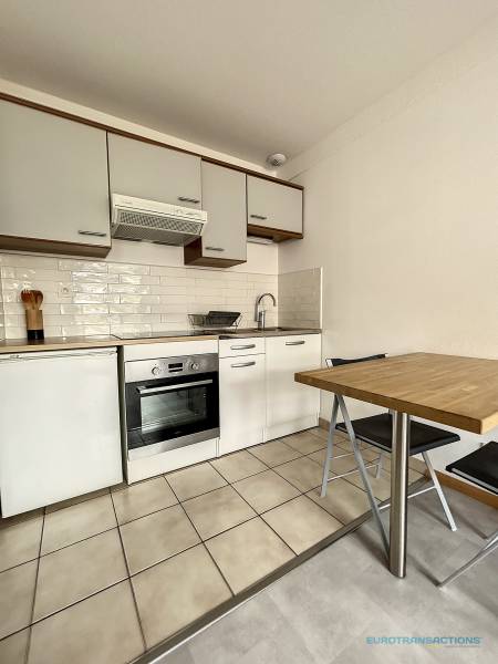 Il comprend : une cuisine équipée (four, plaque, hotte et frigo), table et chaises, ouverte sur un lumineux séjour avec canapé d’angle donnant accès à un balcon plein Sud.