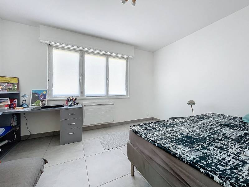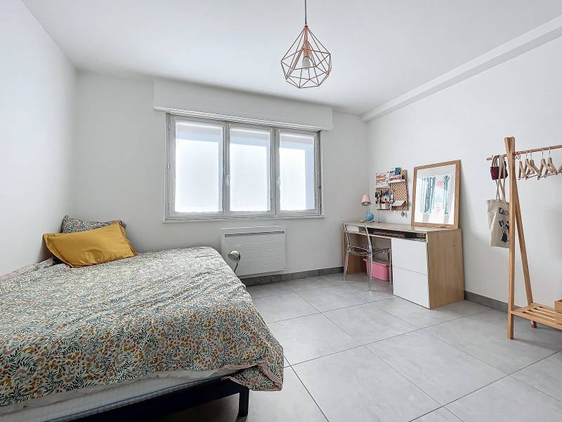 Au rez-de-chaussée : un vaste salon/séjour lumineux ouvert sur une cuisine toute équipée. Deux chambres (12,34 m² et 13,47 m²), une salle de bain ainsi qu'un WC suspendu séparé.