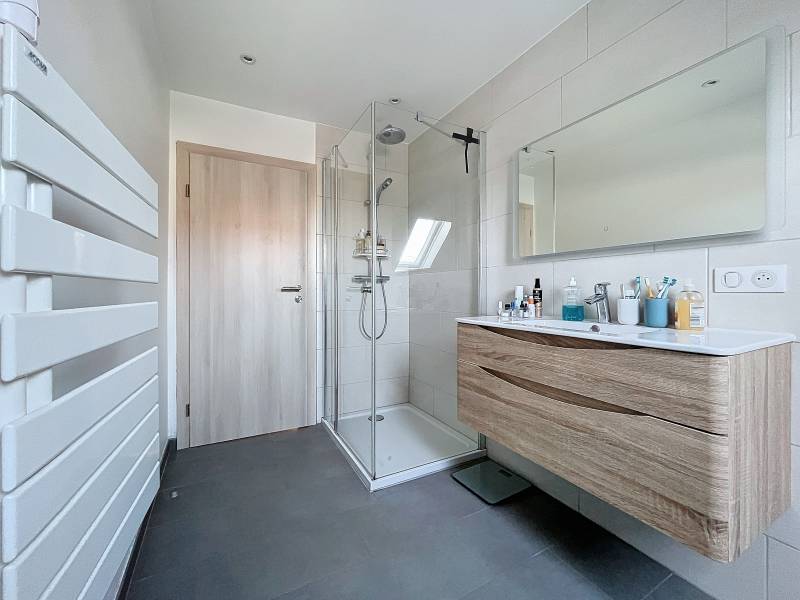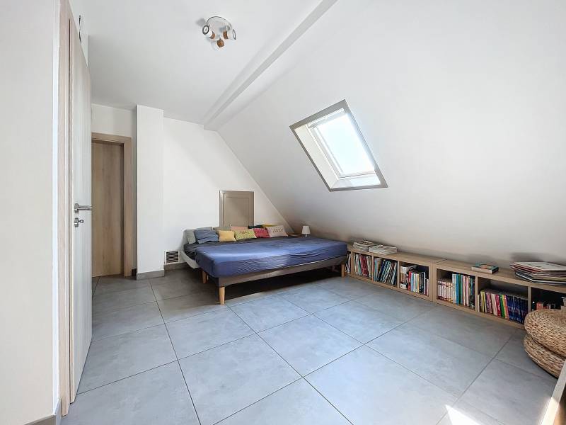 A l'étage : une pièce de vie palière, deux chambres (12,94 m² et 15,22 m²), un dressing ainsi qu'une salle d'eau avec WC.
