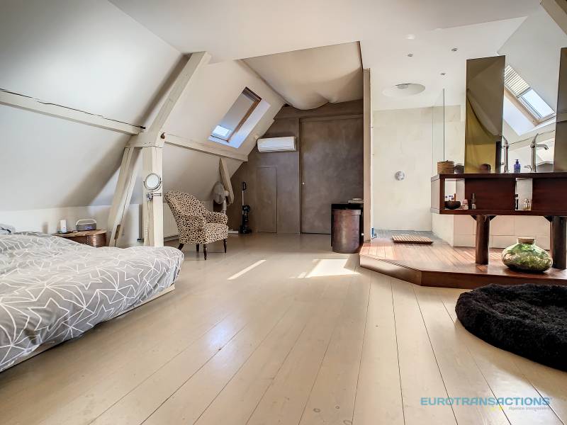 Sous combles, une suite parentale climatisée de 26 m² avec sa salle de bain, douche à l'italienne et un dressing de 7,7 m².