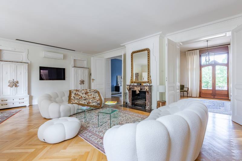 Dès l'entrée, les volumes généreux, les hauteurs sous plafond de 3.50 mètres et les éléments d'époque subtilement conservés (parquets, moulures, menuiseries) donnent le ton : celui d'une demeure élégante, à la fois chaleureuse et intemporelle.
