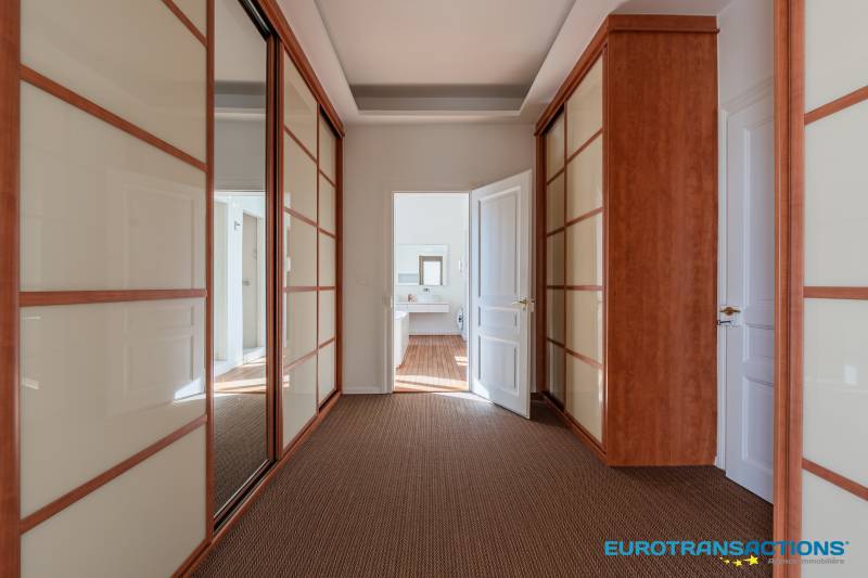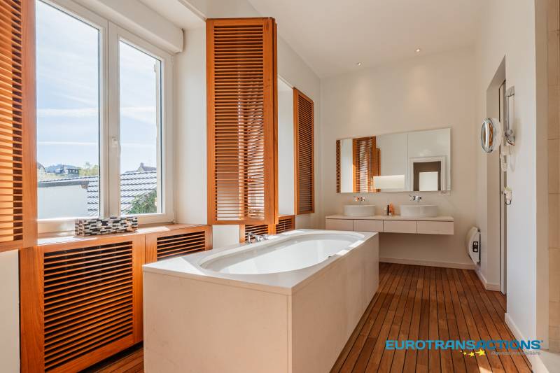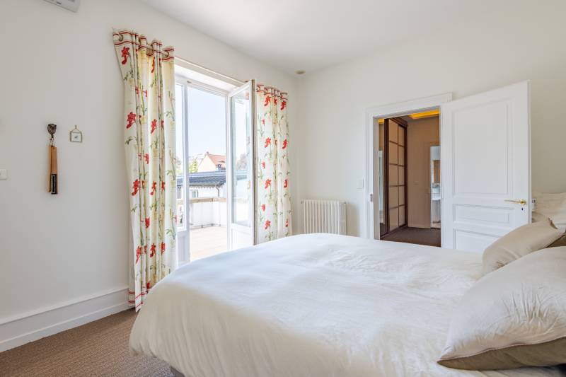 La suite parentale, à la fois spacieuse et lumineuse, dispose d'un dressing aménagé, d'une grande salle de bains avec douche et baignoire, ainsi que d'un accès à une terrasse privative surplombant le jardin.