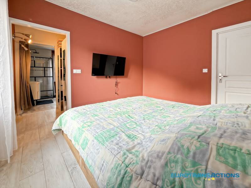 Le rez-de-chaussée se compose d’une entrée qui dessert un salon-salle à manger, ainsi qu’une cuisine donnant directement accès à la terrasse et au jardin. Vous y trouverez également une chambre avec dressing et une salle d’eau, permettant une vie quotidienne confortable sans nécessité d’utiliser l’étage.