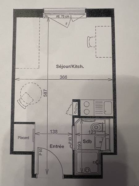 L'appartement est meublé : kitchenette avec rangements - plaque de cuisson - réfrigérateur - micro-ondes, salle d'eau aménagée douche -ensemble vasque - luminaire - miroir, et pièce à vivre avec bureau.