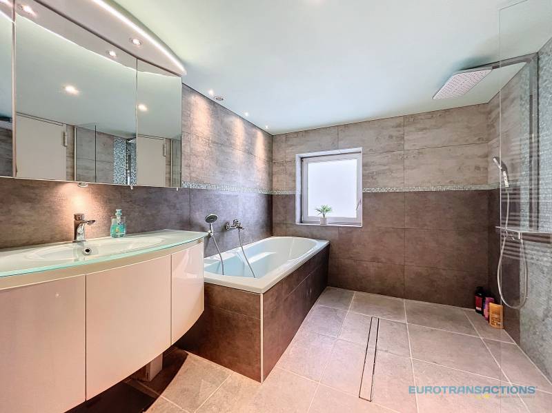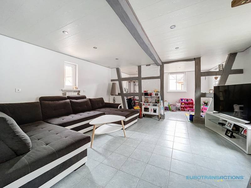 Chaleureuse maison alsacienne entièrement rénovée de 108,60 m² (137,19m² au sol) disposant au rez-de-chaussée d'une entrée, d'un spacieux salon/séjour, d'une cuisine/salle à manger, d'une salle d'eau et d'un WC séparé.