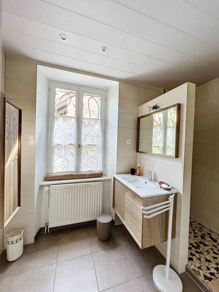 De plain pied : pièce de vie de 46 m² comprenant un salon-séjour avec son kachelofe, une cuisine équipée, accès à l'arrière de la maison sur une terrasse vue sur le château, une chambre, une salle d'eau - WC, une buanderie.